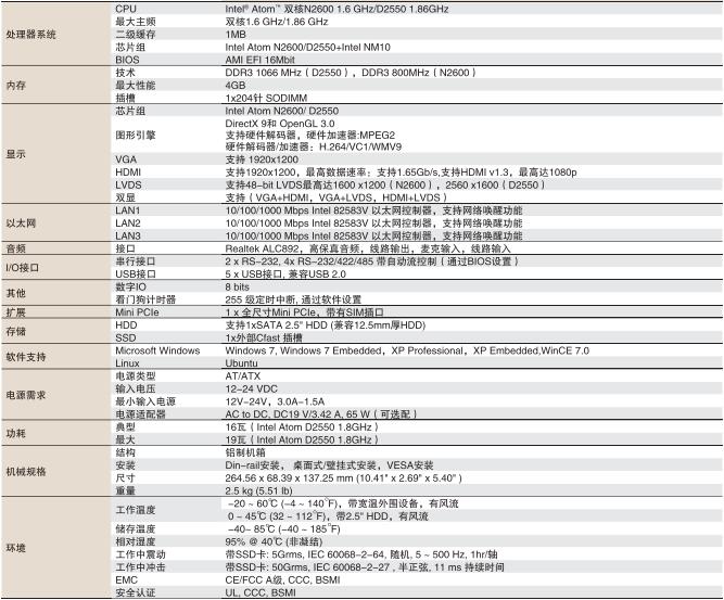 ●采用lntelo Atom· N26001.6 GHz/D25501.86GHz处理器的无风扇紧湊型嵌入式工控机